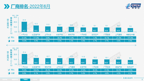 6月自主品牌零售81.0万辆,同比增长35.0%,环比增长31.0%。6月自主品牌国内零售份额为42.5%,同比增长3.8个百分点;1-6月累计份额43.1%,相对于2021年同期增长4.6个百分点。6月自主品牌批发市场份额45.2%,较去年同期份额增加1.5个百分点;1-6月自主品牌累计份额48.0%,相对于2021年同期增加6.1个百分点。自主在新能源市场获得明显增量,头部企业表现优异,比亚迪汽车、长安汽车、吉利汽车和奇瑞汽车等传统车企品牌份额提升明显。上海车企产销增幅较强,体现产业稳工复产的效果突出。