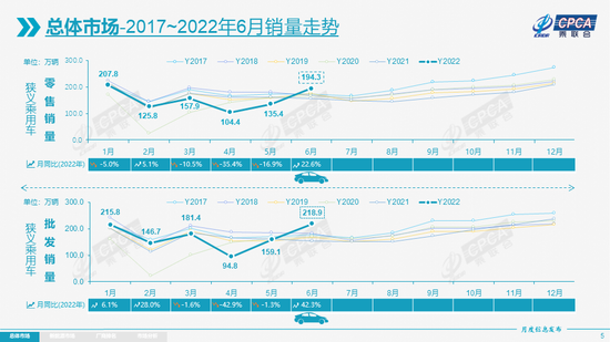 6月的车市销量数据超预期暴增:2022年6月乘用车市场零售达到194.3万辆,同比增长22.6%,环比增长43.5%,6月零售环比增速处于近6年同期历史最高值。6月厂商批发销量218.9万辆,同比增长42.3%,环比增长37.6%,受新能源市场拉动,部分车企表现分化明显。1-6月的厂商批发销量达到1017.2万辆,同比增长3.4%。