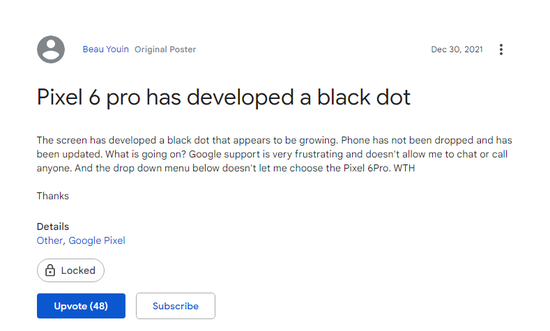 其中一位 Pixel 6 Pro 用户“Beau Youin”称,手机屏幕上出现了一个黑点,并且似乎在不断变大。然而手机并没有摔过,也没有浸泡在水中过,这个情况出现很让人担心。