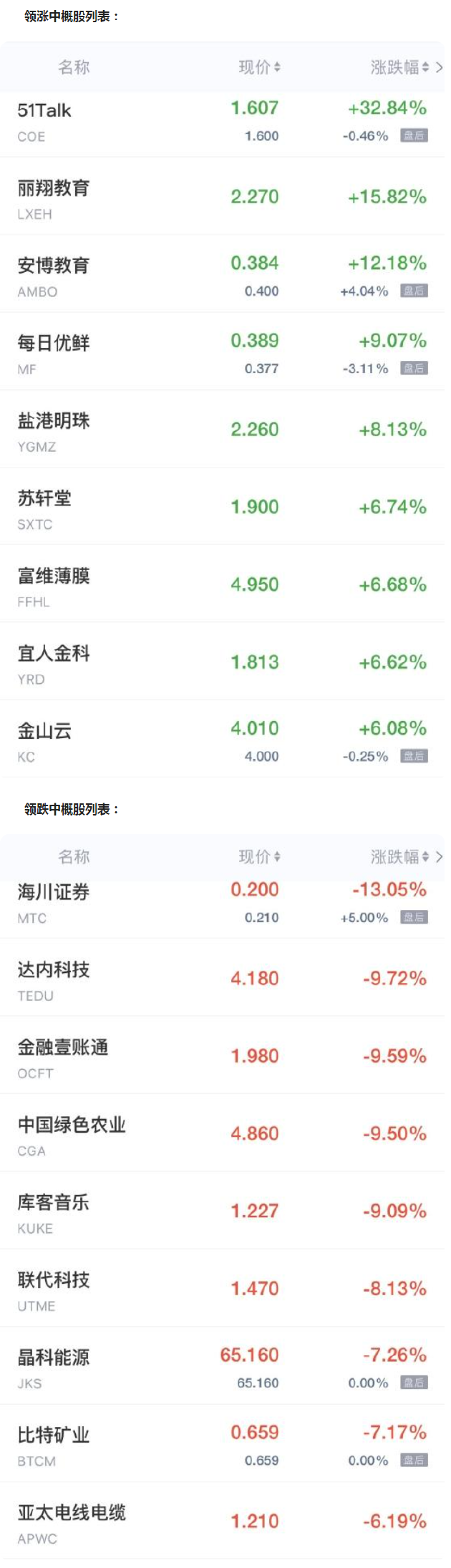 51Talk涨近33%,每日优鲜涨超9%,金山云涨超6%,百世集团涨超5%,猎豹移动、趣头条涨近4%,知乎、搜狐、新氧涨超3%,迅雷涨近3%,欢聚集团、唯品会、拼多多、雾芯科技、达达集团、涂鸦智能涨超2%,爱奇艺、新东方、蔚来汽车、中通、陆金所控股涨超1%,京东、富途控股、途牛、开心汽车涨近1%。