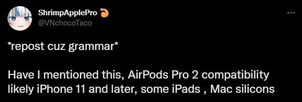 不过,据海外博主ShrimpApplePro透露,AirPods Pro 2对手机型号有要求,仅可以适配iPhone 11或以上的机型、部分iPad机型、以及搭载M系列自研芯片的Mac电脑。