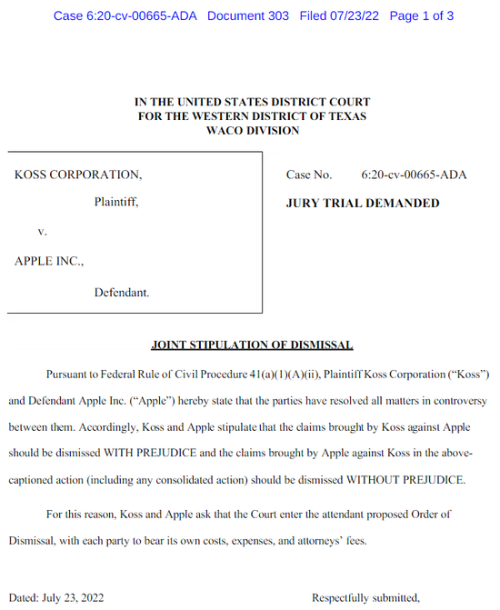 7 月 23 日,在美国德克萨斯州西区地方法院提交的一份“联合解雇规定”文件中,Apple 和 Koss 的法律团队表示 —— 双方已解决他们之间存在的所有争议事项。