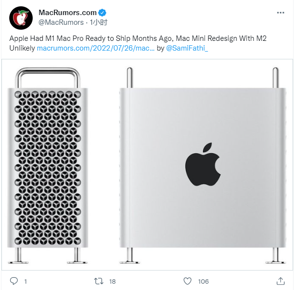 彭博社 Mark Gurman 透露,苹果公司有一款配备 M1 Apple Silicon 芯片的 Mac Pro 准备在“几个月前”向客户推出和发货,但苹果最终决定等待今年晚些时候推出“M2 Extreme”版 Mac Pro。