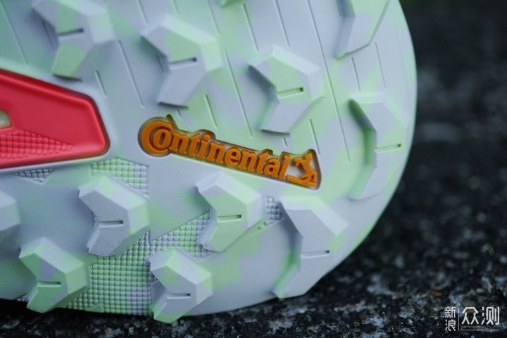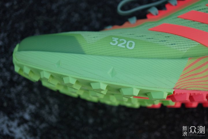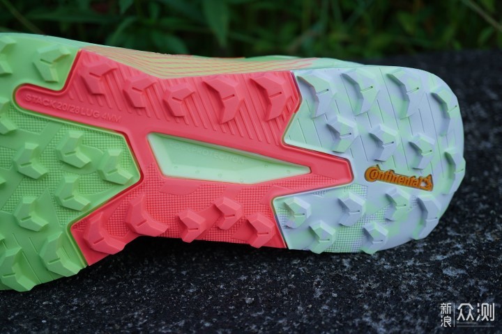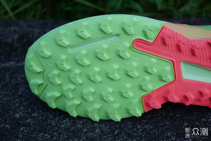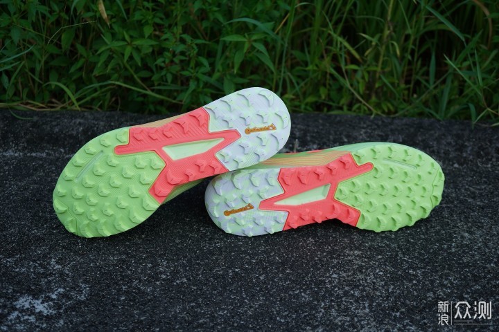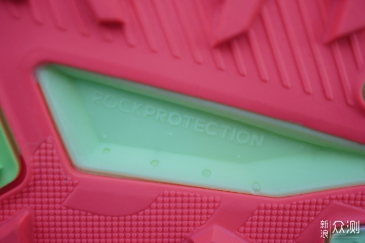 ▲AGRAVIC FLOW 2采用了前绿、中粉红、后迷彩绿的配色,但前掌和后掌的齿耳设计风格其实以是一致的(朝向、大小不同)。4mm高的齿耳,在山地有着很强的抓地和防滑性能,同时又因其粗疏的排布,不容易存泥、存石。中掌的ROCKPROTECTION异形结构质地坚硬,有很强的抗扭转功能。