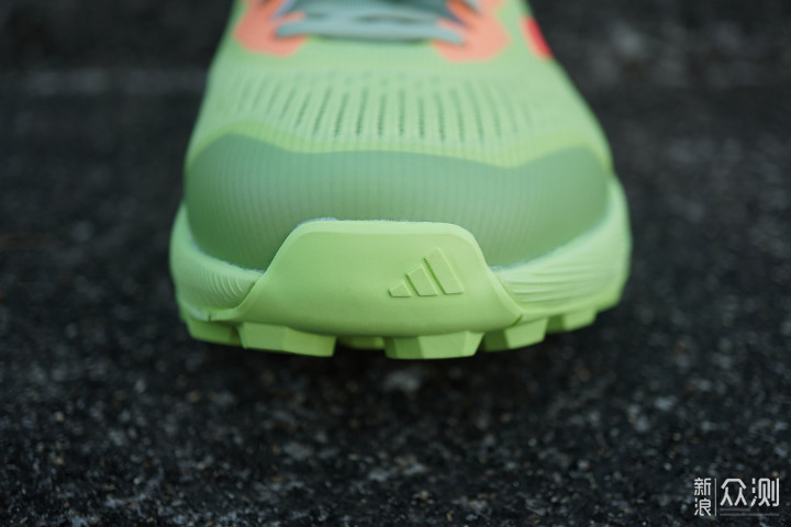 ▲防撞鞋头专业跑鞋基本都会设置,特别是越野跑鞋,要考虑到在山野间脚趾踢到树桩、石头的可能,从而形成有效保护。AGRAVIC FLOW 2的鞋头比较宽,保护面积自然也宽,鞋头上的阿迪标志可以说很有辨识度了。