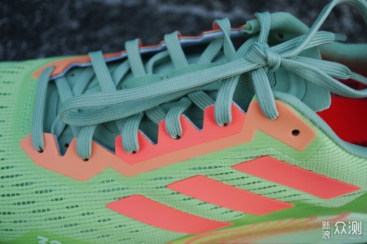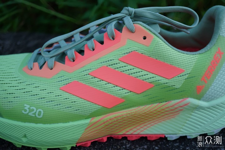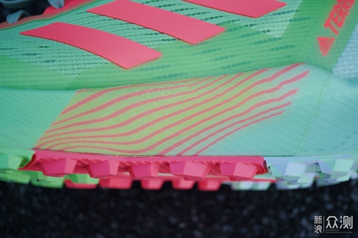 ▲粉红色的阿迪logo丰富了网面元素,也可以提升鞋面的整体支撑性能。越野跑鞋不同于休闲跑鞋,因为面临的路段可能更复杂,所以鞋面对脚掌的必要保护还是要有的(即便会因此增加鞋重)。