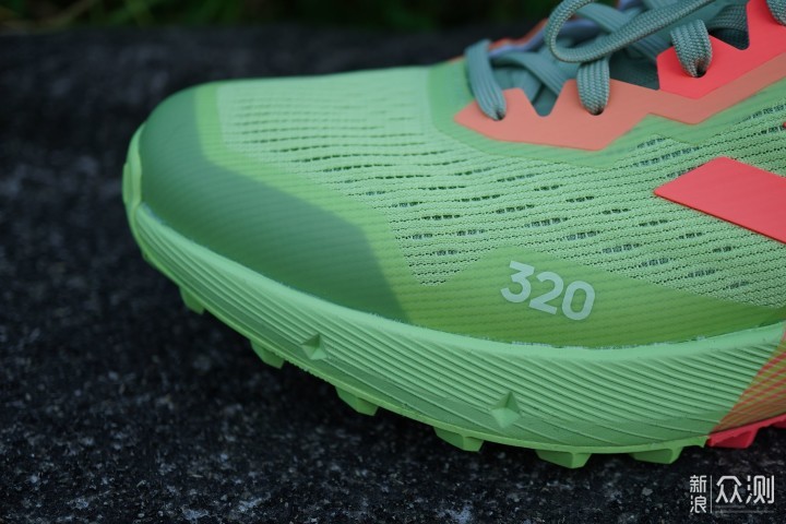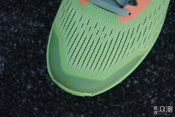 ▲AGRAVIC FLOW 2前掌外缘有一圈TPU贴片,这样的设置我总是觉得实用的,因为下小雨或早上有露水(越野赛早上过草地的情况很常见),鞋头会甩水到掌面,如果没有这一圈防水贴片,鞋楦内很快会变得湿淋淋的,会比较难受。鞋网面采用了双层编织,外疏内密,一是提升鞋面强度,二来可以在保证良好透气的同时防沙防尘,其实都是应对山野场景的针对性设计了(公路跑鞋面设计标准就没有这么高)。