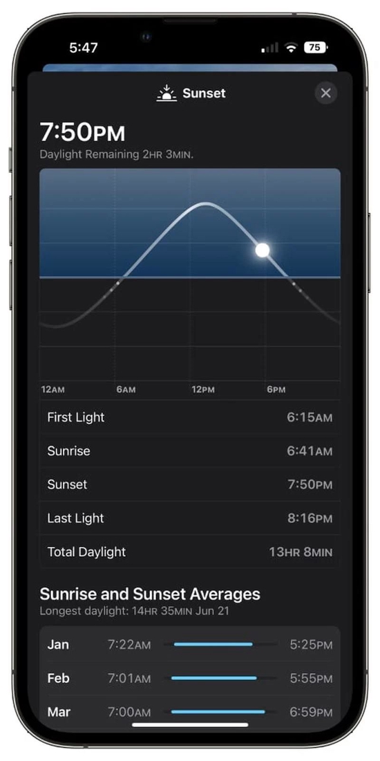 “日落和日出”可以让你知道日出或日落的时间,同时它还包括每月日出和日落的平均值和总日光的读数。