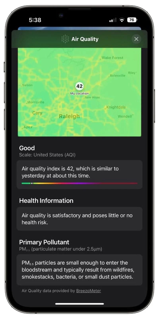 空气质量这块展示了您所在地区当前空气状况的图表,以及当前状况和主要污染物对健康影响的附加信息。此外,你还可以看到更大的空气质量地图,预计国内同样是由“和风天气”提供信息。