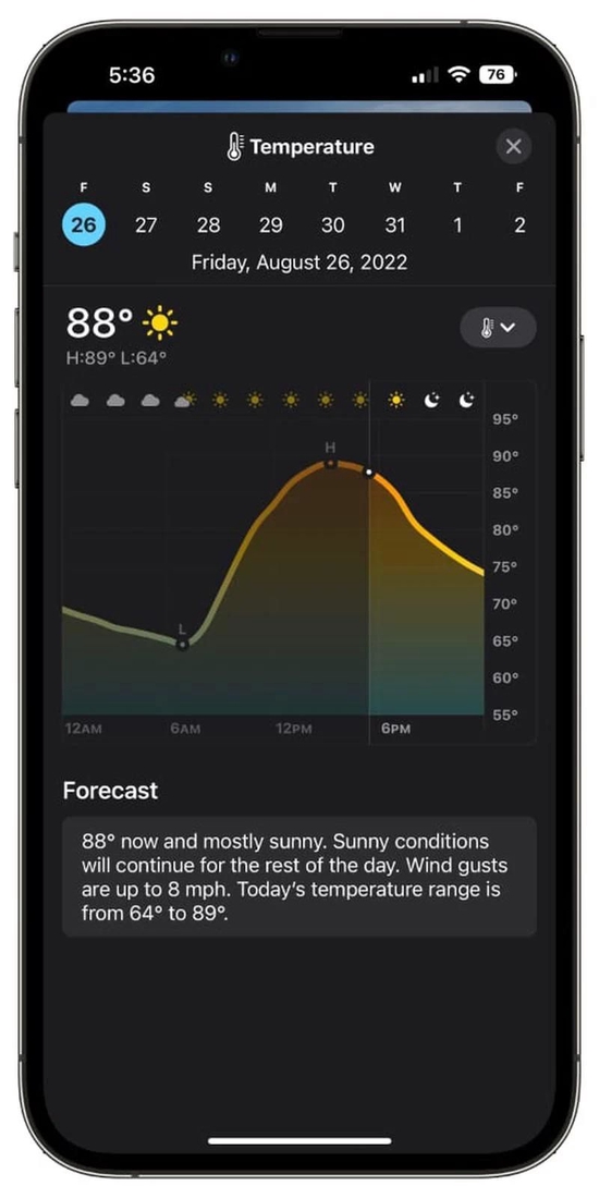 温度部分展示了全天的温度曲线图,包括最高和最低。这应该可以解决 iOS 15 天气应用中存在的一个问题,从而不会再有用户抱怨不清楚气温何时才是每日最低点。此外,这一部分还提供了天气状况的文本概述。