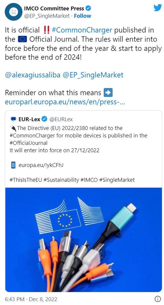 现在,欧盟已经正式给出了这个时间了,那就是2024年12月28日之前(将执行新规的设备包含了平板电脑、数码相机、耳机和手持视频游戏机等),届时所有的欧盟成员国都要遵守这个规定,并将其列为强制执行标准。