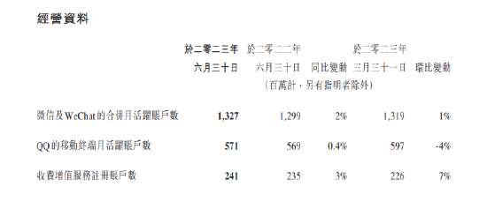 截至6月30日,微信及WeChat合并月活账户数达13.27亿 同比增2%;