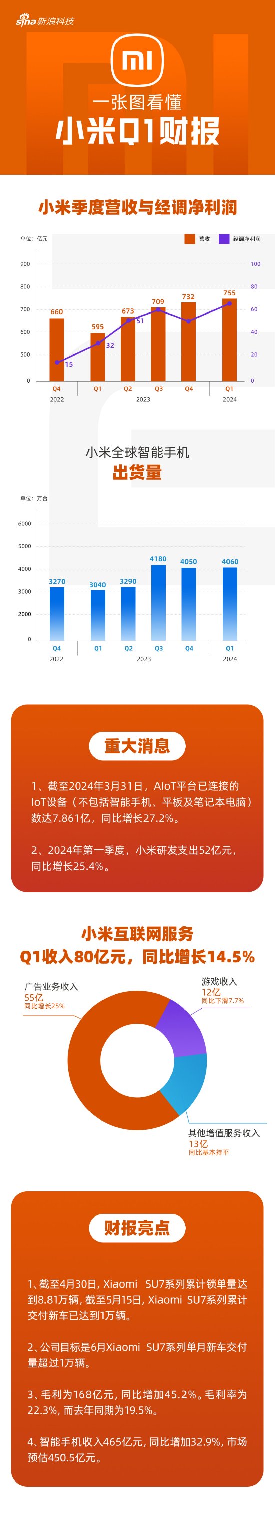 小米发布第一季度财报:营收755亿元(智能手机465亿+IoT与生活消费产品204亿+互联网服务80亿+其他6亿),同比增长27%;经调净利润65亿,同比增长100.8%。截至4月30日,Xiaomi SU7系列累计锁单量达到8.81万辆,截至5月15日,Xiaomi SU7系列累计交付新车已达到1万辆。公司目标是6月Xiaomi SU7系列单月新车交付量超过1万辆。