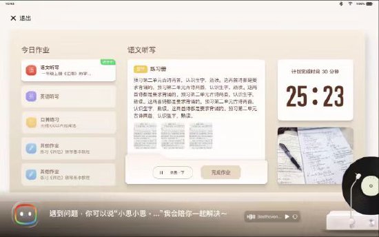 赵璞铮讲到,此次升级“小思作业模式”的核心,就是“给孩子构建一个专注的书桌场景”。小思作业模式有多样化的作业布置方式,可以自己拍照添加,也可以喊家长通过家长端添加;在开始写作业之后,会有任务计时、背景轻音乐,打造高效自学的绿色学习环境。写完之后,可以拍照提交作业,同步到家长端。