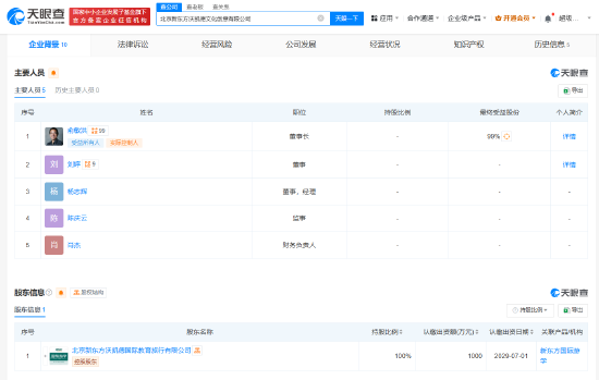 新浪科技讯 7月8日下午消息,天眼查App显示,近日,北京新东方沃凯德文化创意有限公司成立,法定代表人、董事长为俞敏洪,注册资本1000万人民币,经营范围包括互联网销售、数字创意产品展览展示服务、数字文化创意软件开发、旅游开发项目策划咨询等。股东信息显示,该公司由北京新东方沃凯德国际教育旅行有限公司全资持股,后者为北京新东方文旅有限公司全资子公司。