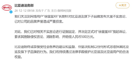 12月12日,比亚迪正式宣布起诉网络用户“徐里里Xll”,并表示,该网络用户长期发布针对比亚迪及旗下子品牌的大量不实言论,严重损害公司的品牌声誉。因此,比亚迪对其正式提起诉讼,要求删除侵权言论并赔偿人民币500万元。
