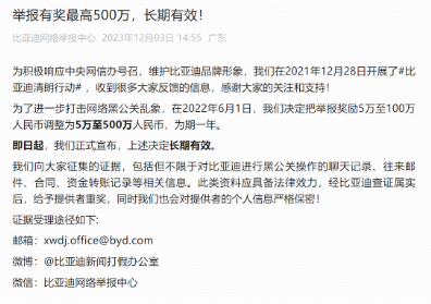早在2021年,比亚迪就宣布悬赏5-100万打击黑公关;在2022年,又将奖金提高到500万元,而后宣布该决定长期有效,呼吁广大网友和社会各界提供相关证据和线索。在近两年的时间里,比亚迪累计起诉近20个黑账号,同时对30多个重点黑号进行密切关注,对其发布的内容及评论区持续做证据保全。