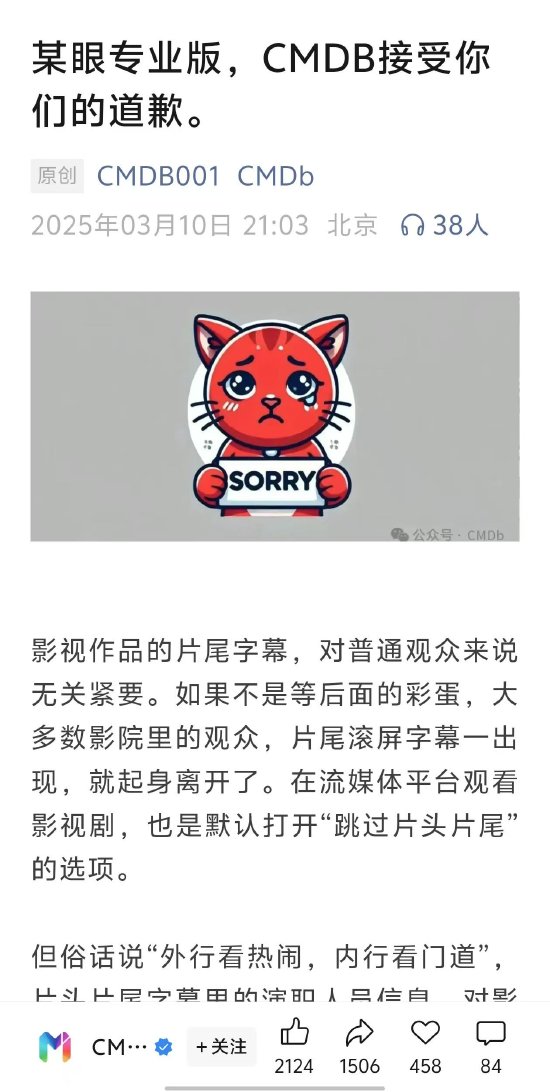 新浪科技就相关信息求证猫眼,猫眼官方表示:针对CMDB提到的猫眼专业版片尾字幕问题,我们第一时间进行内部核实,确认相关信息由合作的第三方服务商提供。在与服务商积极沟通核实的同时,我们也第一时间下线了该部分信息,且已当面与CMDB说明情况,对此次事件中出现的审核疏漏真诚致歉、解除误会。