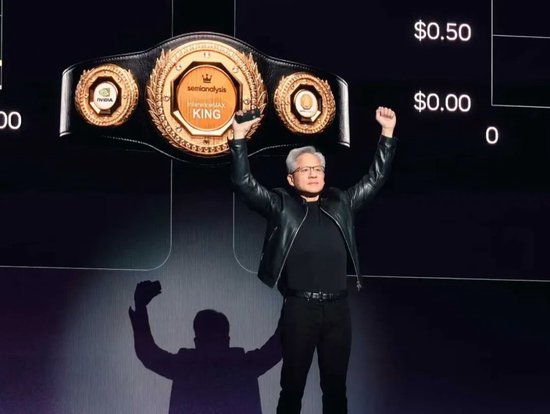 黄仁勋以手势示意“Token King”英伟达token成本全球最低。(图片来源:GTC 2026)