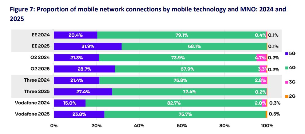 英国市场的一项关键进展是5G独立组网(SA)的持续部署。Ofcom报告显示,目前所有连接中只有2%使用了5G SA技术。