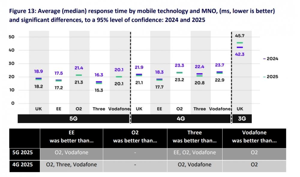 Three在英国移动市场拥有最低5G网络时延,而EE在4G网络上的时延最低。O2在5G和4G网络上的平均响应时间略高于其他运营商,但Ofcom报告指出,即使在最苛刻的在线活动中,这些响应时间仍然足以提供良好的用户体验。