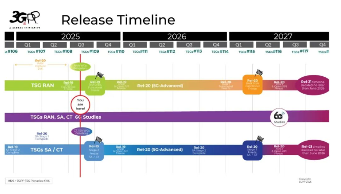 下一场3GPP重大聚会将是 TSG#109 全会,三大技术规范组将于9月15–19日在北京重聚,对R19技术规范和技术报告进行最终讨论与批准。