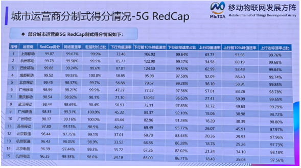 在测评覆盖的十个城市中,排名前十的地市运营商中,5G RedCap网络质量中国移动占据前八席(上海、杭州、西安、成都、北京、广州、重庆和武汉),体现了中国移动在5G RedCap部署上的先行优势。