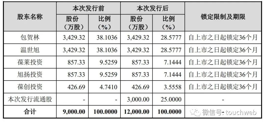 IPO后,包贺林、温世旭分别持股为28.5777%,葆莱投资、旭扬投资分别持股为7.1444%,葆创投资持股为3.5558%。