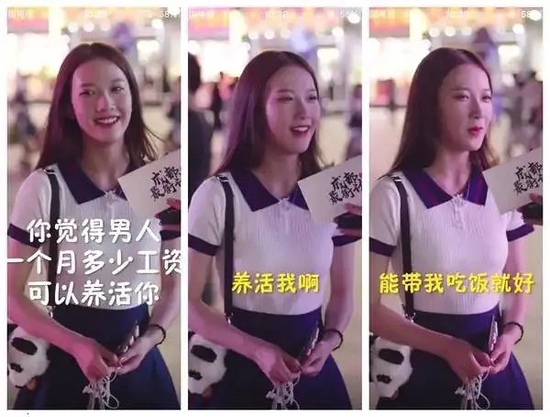 同样是在2018年夏天,“成都小甜甜”在街头接受采访,当被问择偶标准时,凭借一句“能带我吃饭就好”火遍全网。清纯甜美的笑容,加上讨好的恋爱观,几天时间疯狂吸粉超百万。