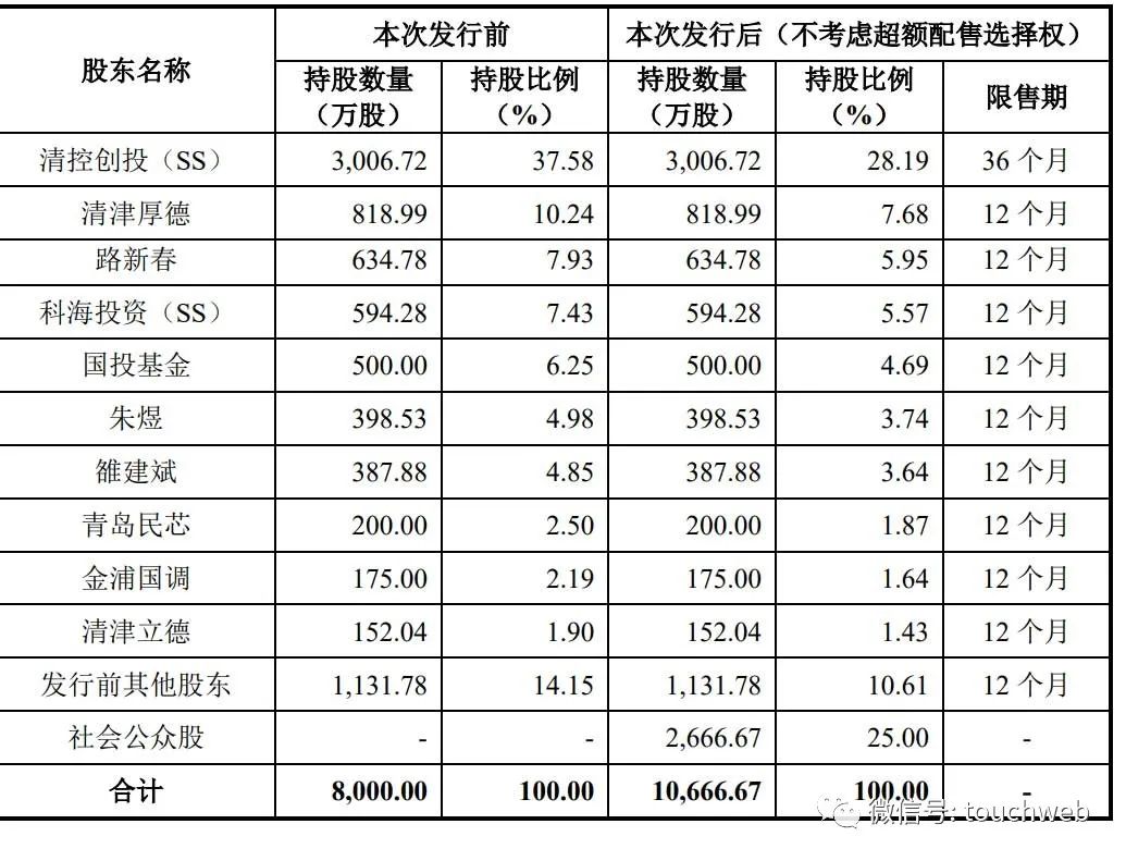 IPO后,清控创投(SS)持股为28.19%,清津厚德持股为7.68%,路新春持股为5.95%,科海投资(SS)持股为5.57%,国投基金持股为4.69%。