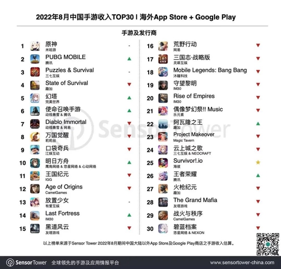 这种情况下,海外市场成为当前国内游戏厂商最看好的掘金地。早在2019年,莉莉丝的《万国觉醒》在国内还没拿到版号,就在海外率先实现了一个月5400万美元的收入,后来一度登上中国手游海外市场收入排名TOP1。近两年《原神》在海外游戏市场的异军突起,更是让国内大大小小的游戏厂商看到了希望。