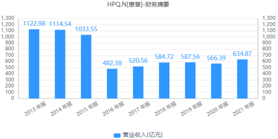 资料显示,拆分之后的惠普企业发展也不顺利。从营收数据上看,2021年惠普企业的总收入为277.8亿美元,收入规模仅相当于2016年同期(501.2亿美元)的55%。截至10月13日,惠普企业总市值为165亿美元。