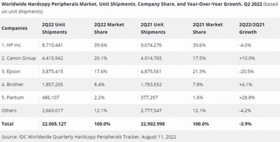 根据IDC数据,2022年第二季度全球打印机市场出货量为2200万台,同比下降3.9%。前五大品牌中,佳能、兄弟和奔图营收实现同比正增长,惠普和爱普生则出现同比下滑。