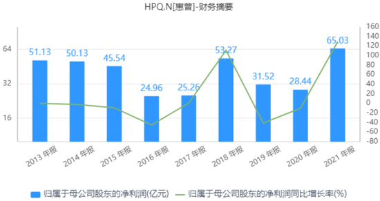 相比惠普企业,近几年惠普公司发展相对较好。数据显示,2016年-2021年,惠普公司总营收从482.38亿美元增长至634.87亿美元,净利润则从24.96亿美元增长至65.03亿美元。其中,2021年度,惠普公司净利润已经创下近十年来新高。