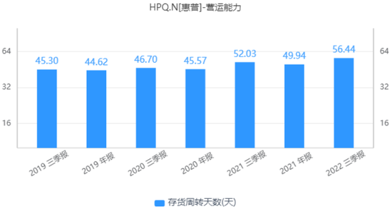 值得注意的是,终端销售的疲软还影响了惠普的营运质量。截至第三财季末,惠普库存总价值为82亿美元,库存周转天数为56天,相比去年同期增加了4天。