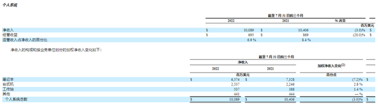 第三财季,惠普个人系统部分实现营收101亿美元,同比下滑3%;其中,消费者业务净收入下降20%,商业净收入增长7%;出货量方面,惠普总出货量下降25%,其中笔记本出货量下降32%,台式机出货量微幅上升1%。