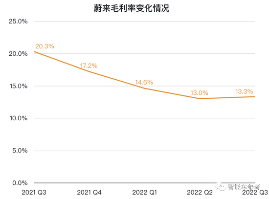2022年第三季度,蔚来的毛利率为13.3%,而2021年第三季度为20.3%、2022年第二季度为13.0%。