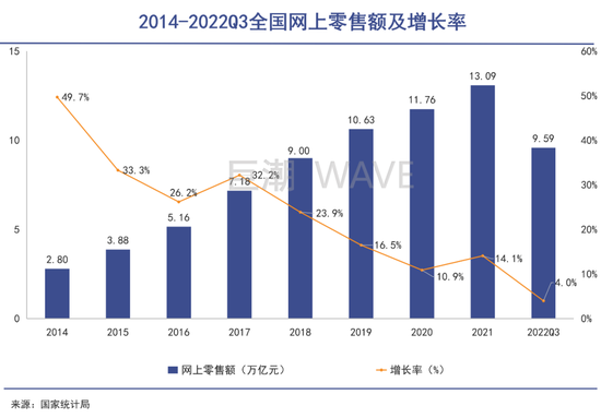 2020年进入疫情以来,全国网上零售额增长又有一个明显降速,仅为10.9%,虽然在2021年略有回升,但终于在2022年后劲不足,一落千丈。