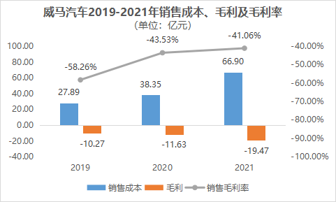 作为造车企业,威马成本的大头自然是制造。威马2019-2021三年的销售成本分别为27.89亿元、38.35亿元和66.90亿元。因此,可以算出三年的毛利全部为负。