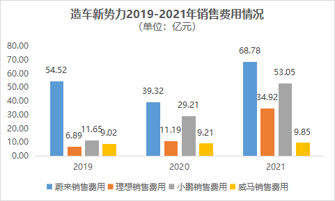 在营销上,威马同样有些“不进则退”。2019年,除蔚来以外,三家的销售费用基本处于同一水平线上,甚至威马还超过了理想的销售费用。但由于近三年的原地踏步,也像研发一样落后于其他三家。