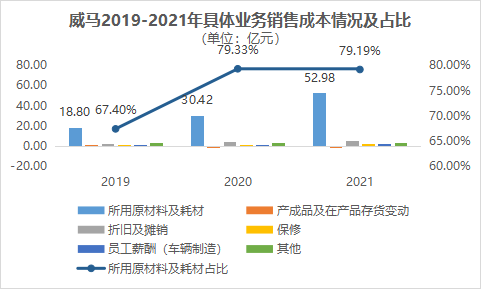 从业务上看,销售成本的大头都在造车所用的原材料及耗材上,2019-2021年分别为18.80亿元、30.42亿元和52.98亿元,占比也上涨了将近10个百分点。结合营业收入可以发现,仅这一项支出就覆盖了全部的营业收入,并且这项支出/营业收入的比值也是越来越大。