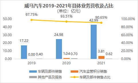 从业务构成看,威马主营的车辆及部件销售业务在近三年占据了相当高的比例,分别达到了97.75%、93.51%和90.65%。随着车辆销售规模的增加,威马获得的新能源汽车积分也越来越多,由此给2021年带来3.81亿元收入。