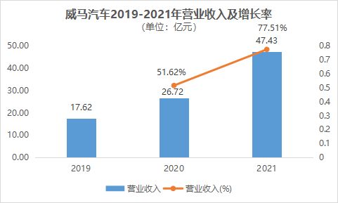 一个企业资金的来源主要有内部经营产生和外部融资。从内部经营情况来看,威马招股书披露,近三年来的营业收入分别为17.62亿元、26.72亿元和47.43亿元,其中2020、2021年的同比增长率达到了51.62%和77.51%。但从合计营收这项看,威马已经有了掉队的迹象:近三年其合计营收达91.77亿元,与“蔚小理”三家差距明显,甚至不足第三名小鹏汽车的三分之一。