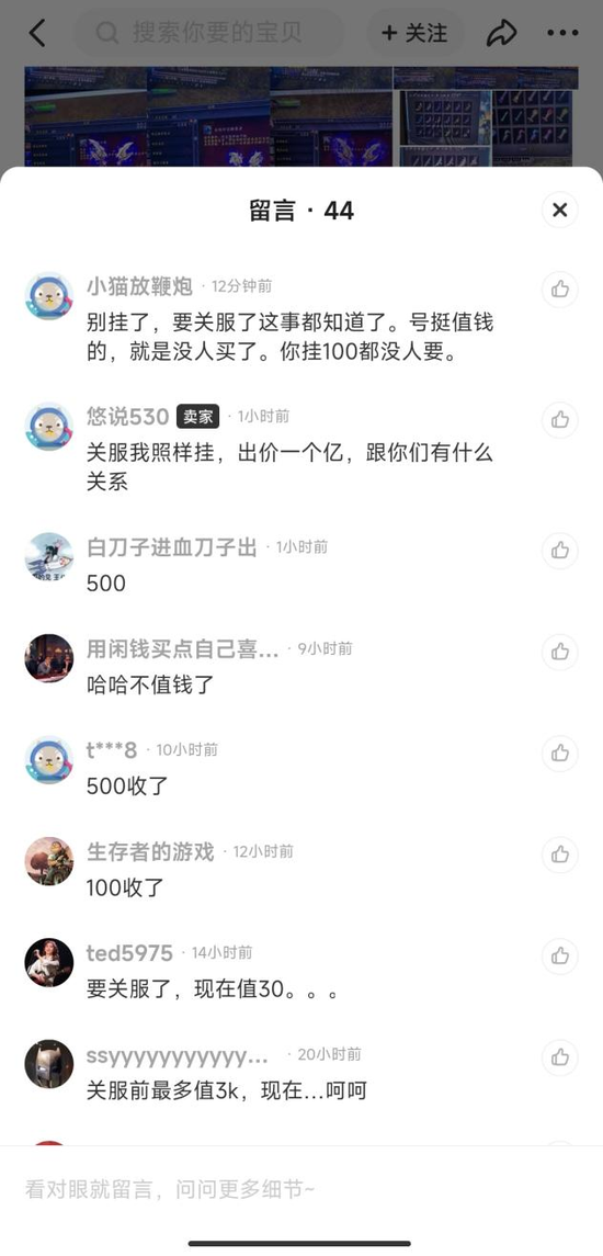 与此同时,对于游戏账号未来的不确定性,还导致了游戏中虚拟资产的价格,瞬间飞流直下。