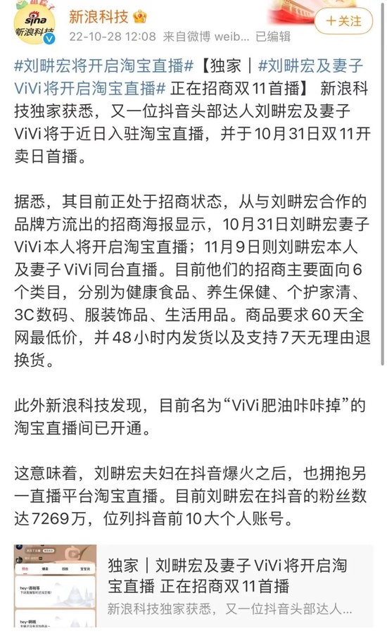 早前就有媒体报道,称刘畊宏即将进行淘宝直播带货,并开启了对外招商,主要产品方向为健康食品、养生保健、个护家清、3C数码、服装饰品、生活用品六大类别,并要求商品保证“60天内全网最低价”、“48小时发货”、“7天无理由退货”等。