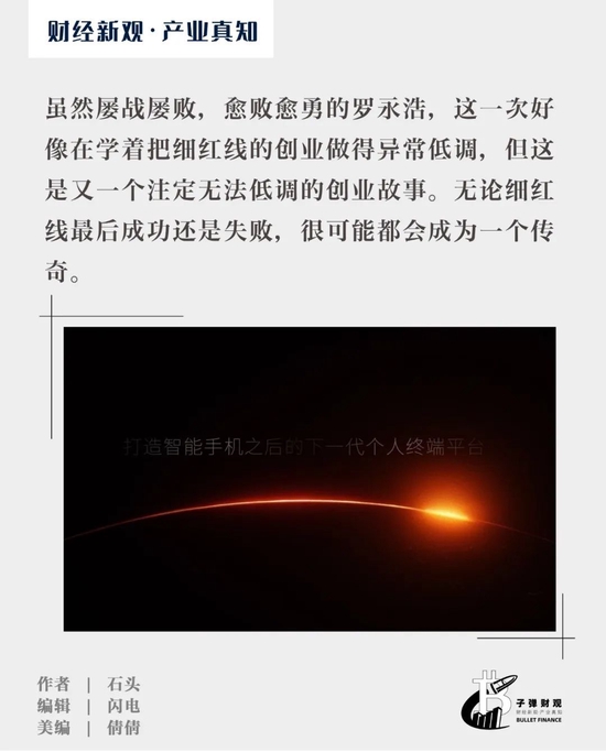 虽然屡战屡败,愈败愈勇的罗永浩,这一次好像在学着把细红线的创业做得异常低调,但这是又一个注定无法低调的创业故事。无论细红线最后成功还是失败,很可能都会成为一个传奇。