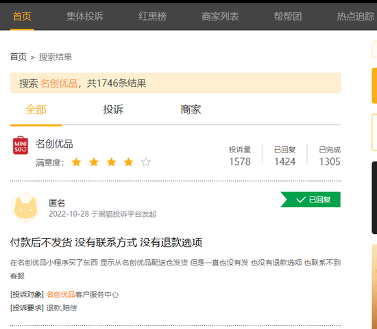 除此之外,代工模式所存在的最大问题还是品牌如何加强对于代工厂所生产产品质量的监管。目前在黑猫投诉平台上,关于名创优品的投诉已达到1578条,涉及到名创优品线上平台以及线下门店。