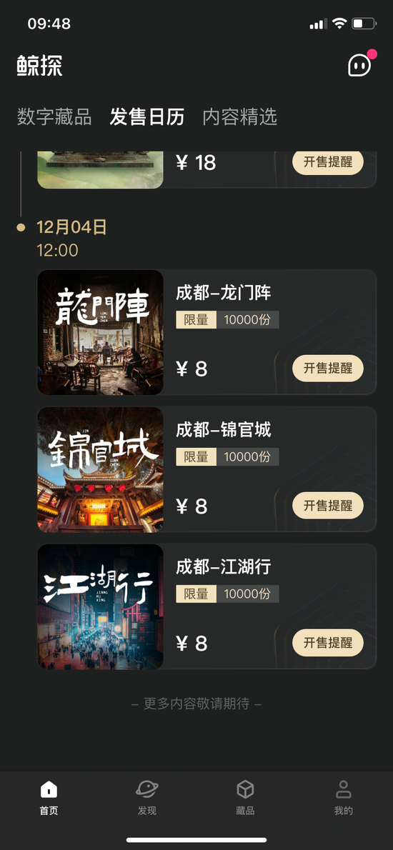在价格上,鲸探的数字藏品显的很亲民,目前首页显示的藏品价格在8-30元,发行量在10000-20000份。从近期发售计划中展示出的数字藏品可以看到,12月4日预开售的成都系列——《成都-龙门阵》《成都-锦官城》《成都-江湖行》,在音乐创作过程中,所听到的声音均有现场采集而成,通过多元素勾勒出其音乐氛围,售价皆为8元。