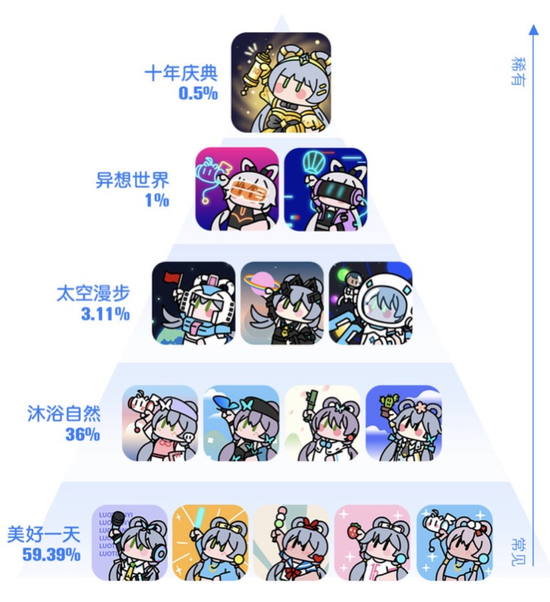 每套藏品都具有稀有值,诚如“干杯!洛天依”联名款原创数字藏品头像打造了“美好一天”“沐浴自然”“太空漫步”“异想世界”“十年庆典”五个主题,其稀有值各不相同,分别是59.39%、36%、3.11%、1%、0.5%。“粗略估计,如果出现稀有藏品,投资翻个倍也是可能的。”