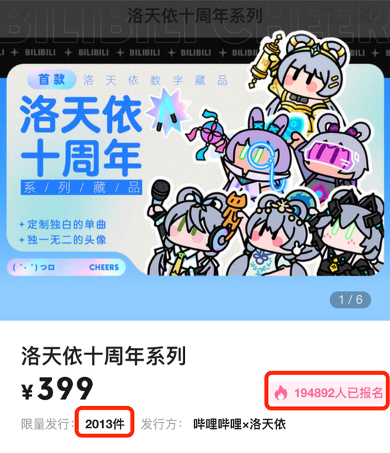 在崔朋看来,这是洛天依的属性使然。“首先,洛天依的IP很大,加上‘限量’仅有2022套,其中有9套是作为奖品进行空投,这就觉得物以稀为贵。还有就是,每套藏品中会包含一张‘干杯!洛天依’联名款原创数字头像、一首可定制独白的十周年特别纪念版数字音乐单曲《光与影的对白》,以及配套的专属单曲封面,再加上藏品都拥有唯一的编码,就感觉很有收藏价值。”